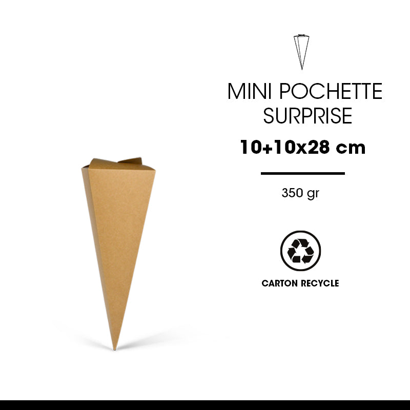 Mini surprise bag made from recycled 350gsm natural brown cardboard. Product ships flat and is easy to assemble.