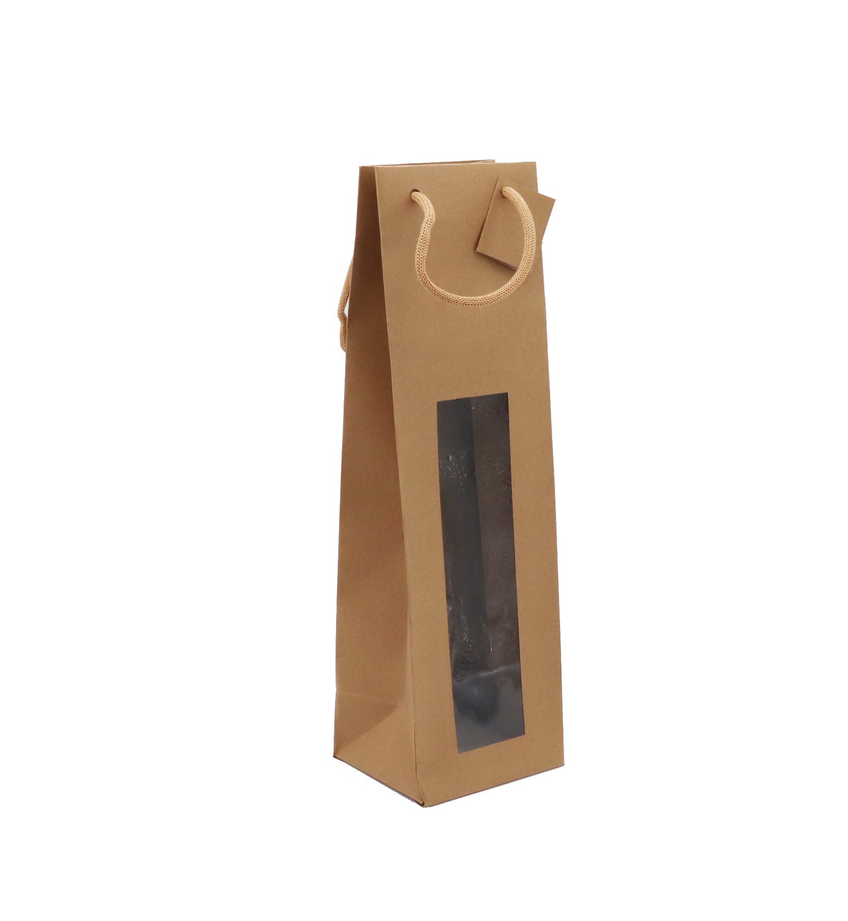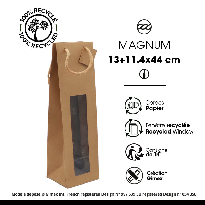 Sac format magnum avec fenêtre, pour mettre vos bouteilles en valeur. Fabriqué à partir d'un papier en kraft brun résistant et qualitatif en 175gr d'épaisseur.Muni d'une fenêtre en plastique recyclé et de poignées en papier résistantes.
