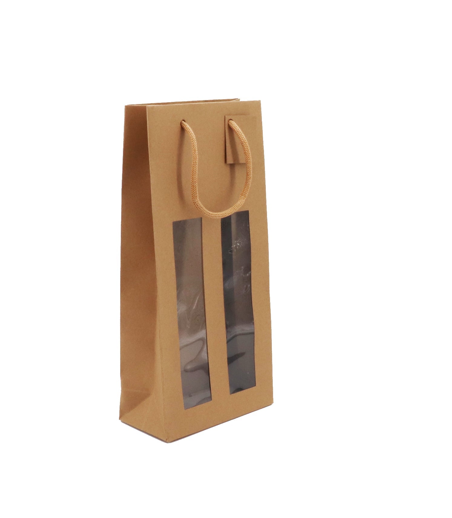 Sac 2 bouteilles à fenêtre kraft brun poignées papier 18+9x38cm par 100