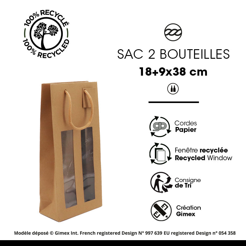 Sac 2 bouteilles fenêtre pour mettre vos produits en valeur, fabiqué à partir d'un papier en kraft brun résistant et qualitatif en 175gr d'épaisseur. Muni de poignées en papier et d'une carte message.