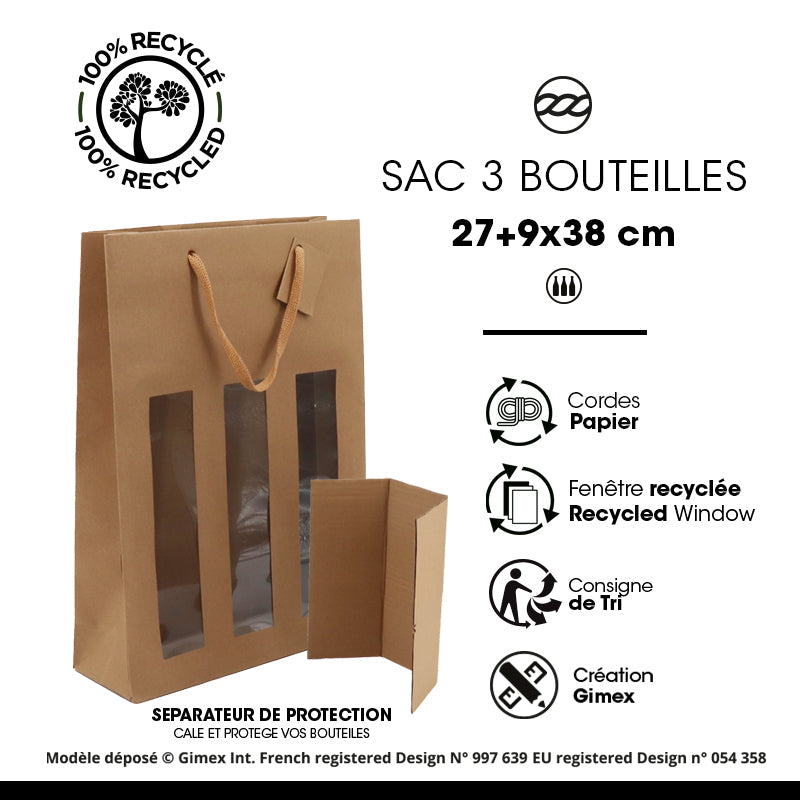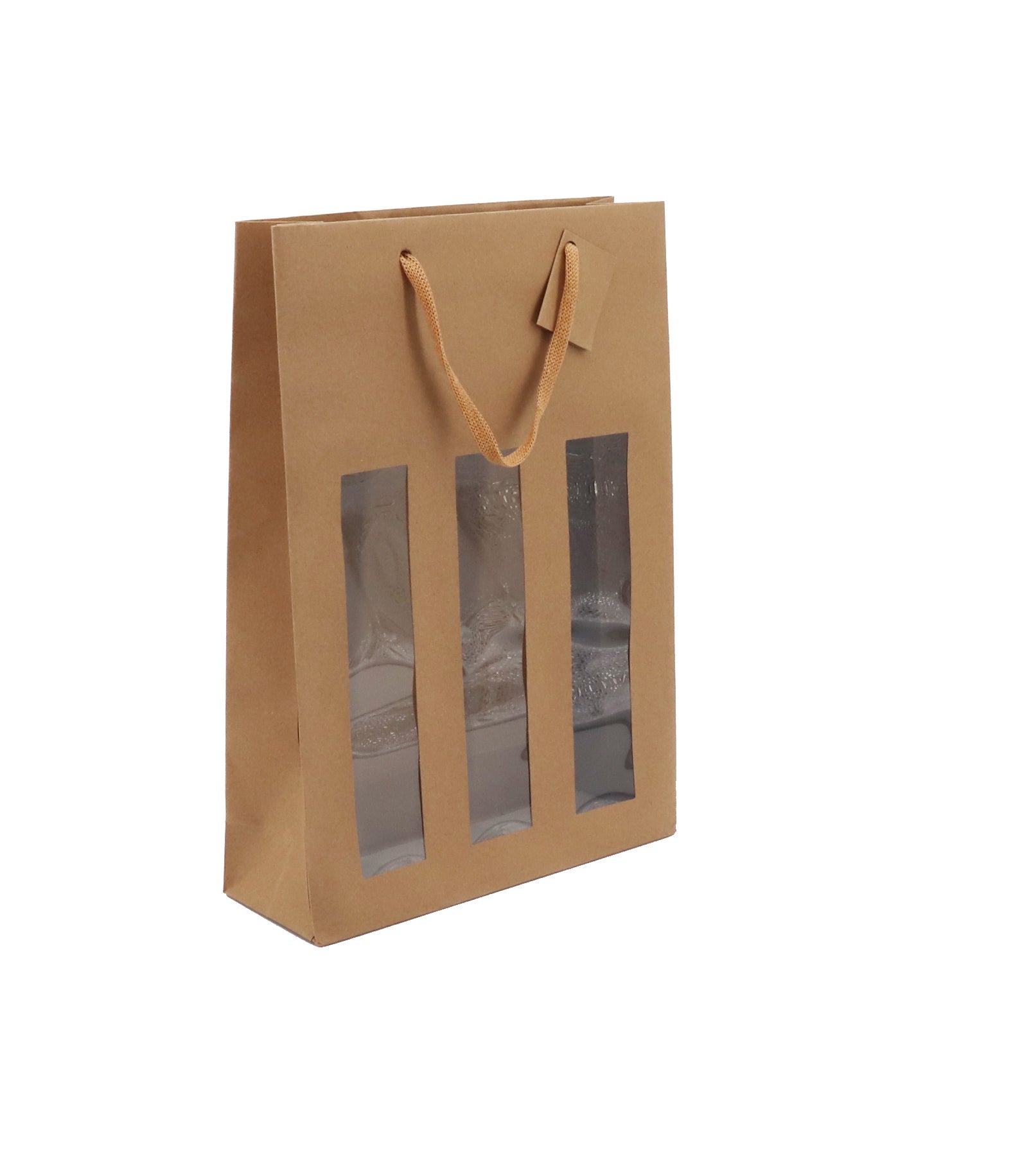 Sac 3 bouteilles avec fenêtre pour mettre vos produits en valeur, fabriqué à partir d'un papier en kraft brun résistant et qualitatif en 175gr d'épaisseur. Muni de poignées en papier et d'une carte message.