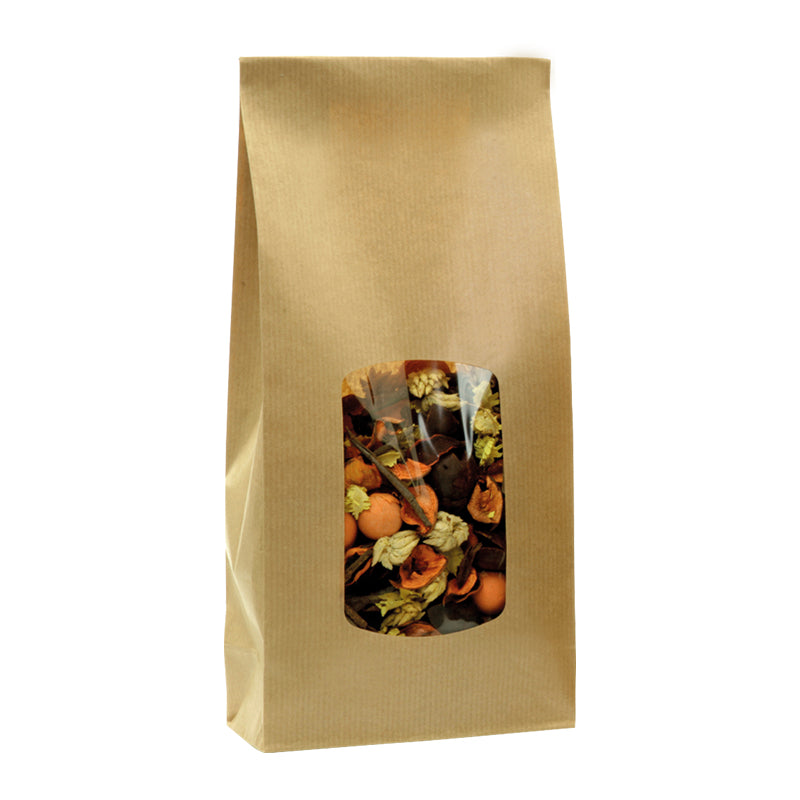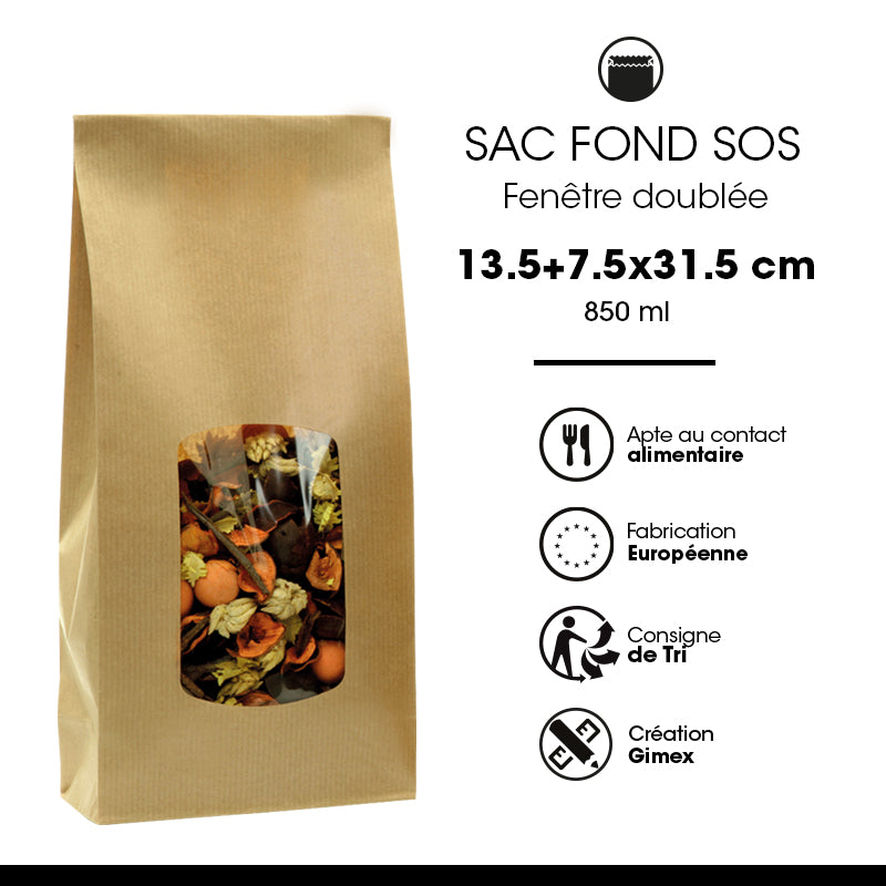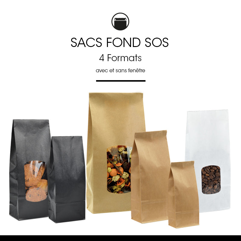 Sac fond SOS avec fenêtre pour mettre en lumière vos produits, fabriqué à partir d'un kraft brun vergé résistant et qualitatif en 90gr d'épaisseur. La face avant de ce modèle est doublée d'un film en polypropylène.
