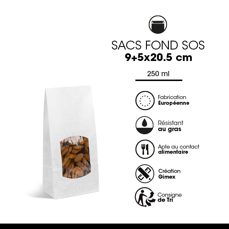 Sac fond SOS 250ml avec fenêtre pour mettre en lumière vos produits, fabriqué à partir d'un kraft blanc résistant et qualitatif en 80gr d'épaisseur. Produit intégralement doublé d'un film polypropylène, adapté au contact alimentaire, résistant au gras et thermo-soudable.
