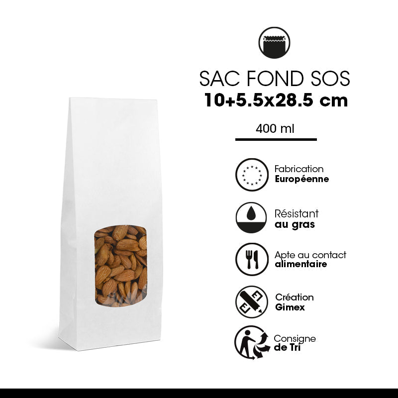 Sac fond SOS 400ml avec fenêtre pour mettre en lumière vos produits, fabriqué à partir d'un kraft blanc résistant et qualitatif en 80gr d'épaisseur. Produit intégralement doublé d'un film polypropylène, adapté au contact alimentaire, résistant au gras et thermo-soudable.