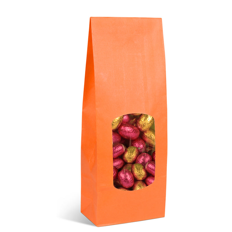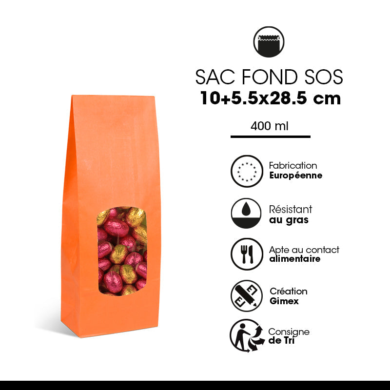 Sac fond SOS orange 400ml avec fenêtre pour mettre en lumière vos produits, fabriqué à partir d'un kraft blanc résistant et qualitatif en 90gr d'épaisseur. Produit intégralement doublé d'un film polypropylène, adapté au contact alimentaire, résistant au gras et thermo-soudable.