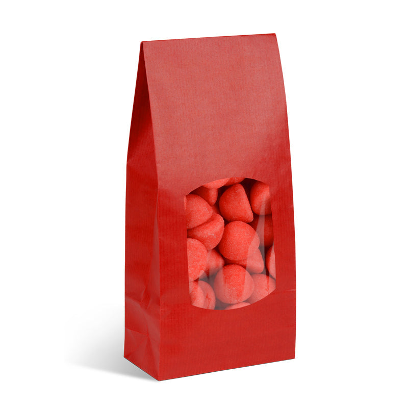 Sac fond SOS rouge avec fenêtre pour mettre en lumière vos produits, fabriqué à partir d'un kraft brun vergé résistant et qualitatif en 80gr d'épaisseur. Produit intégralement doublé d'un film polypropylène, adapté au contact alimentaire, résistant au gras et thermo-soudable.
