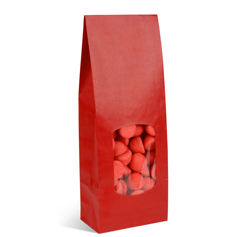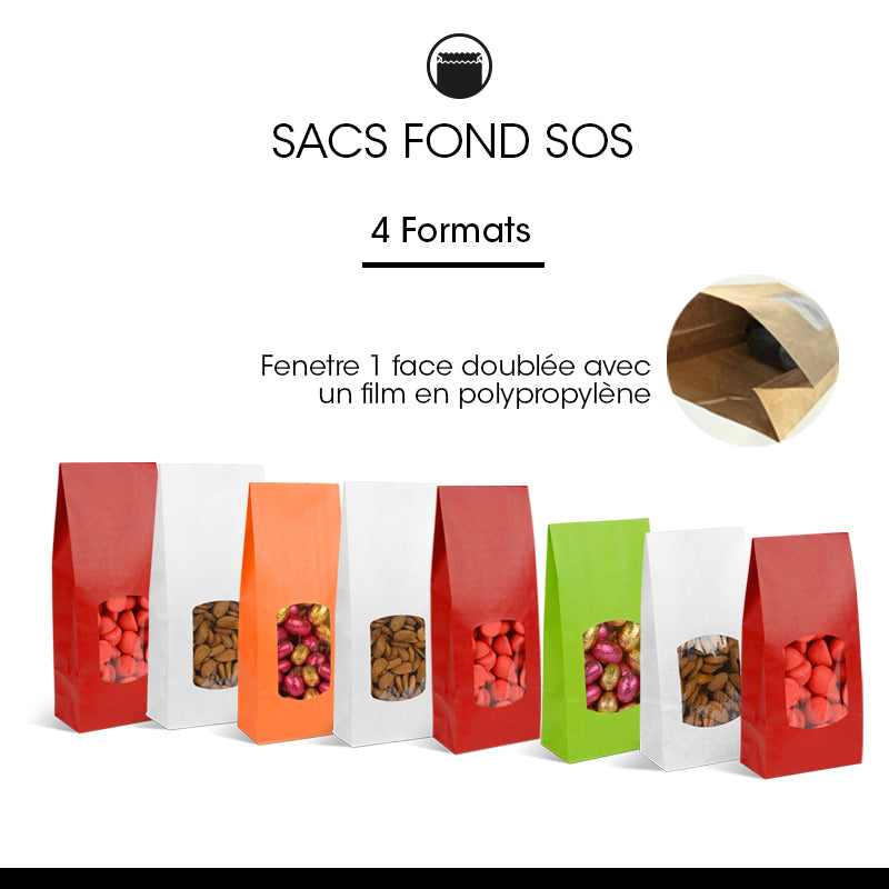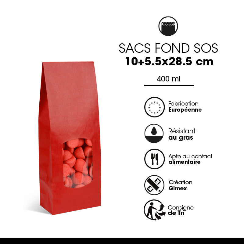 Sac fond SOS rouge 400ml avec fenêtre pour mettre en lumière vos produits, fabriqué à partir d'un kraft brun vergé résistant et qualitatif en 90gr d'épaisseur. Produit intégralement doublé d'un film polypropylène, adapté au contact alimentaire, résistant au gras et thermo-soudable.