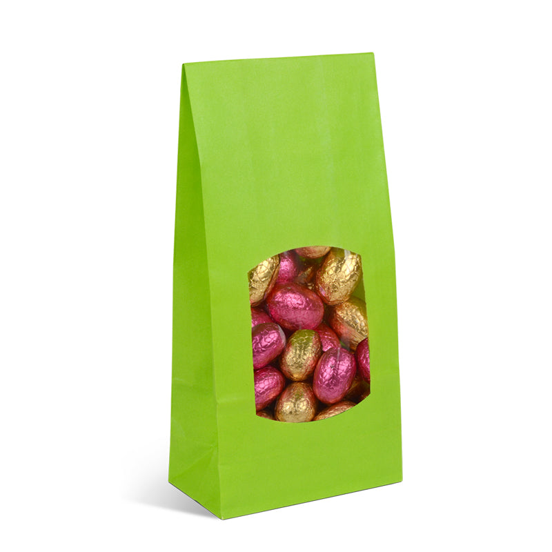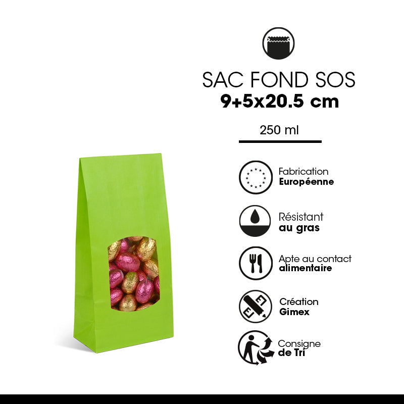 Sac fond SOS vert 250ml avec fenêtre pour mettre en lumière vos produits, fabriqué à partir d'un kraft blanc résistant et qualitatif en 80gr d'épaisseur. Produit intégralement doublé d'un film polypropylène, adapté au contact alimentaire, résistant au gras et thermo-soudable.