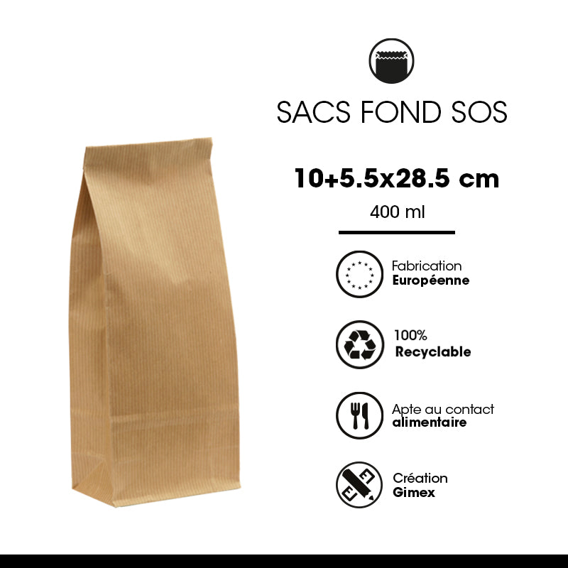 Sac fond SOS fabriqué à partir d'un kraft brun vergé résistant et qualitatif en 90gr d'épaisseur. La face avant de ce modèle est doublée d'un film en polypropylène.