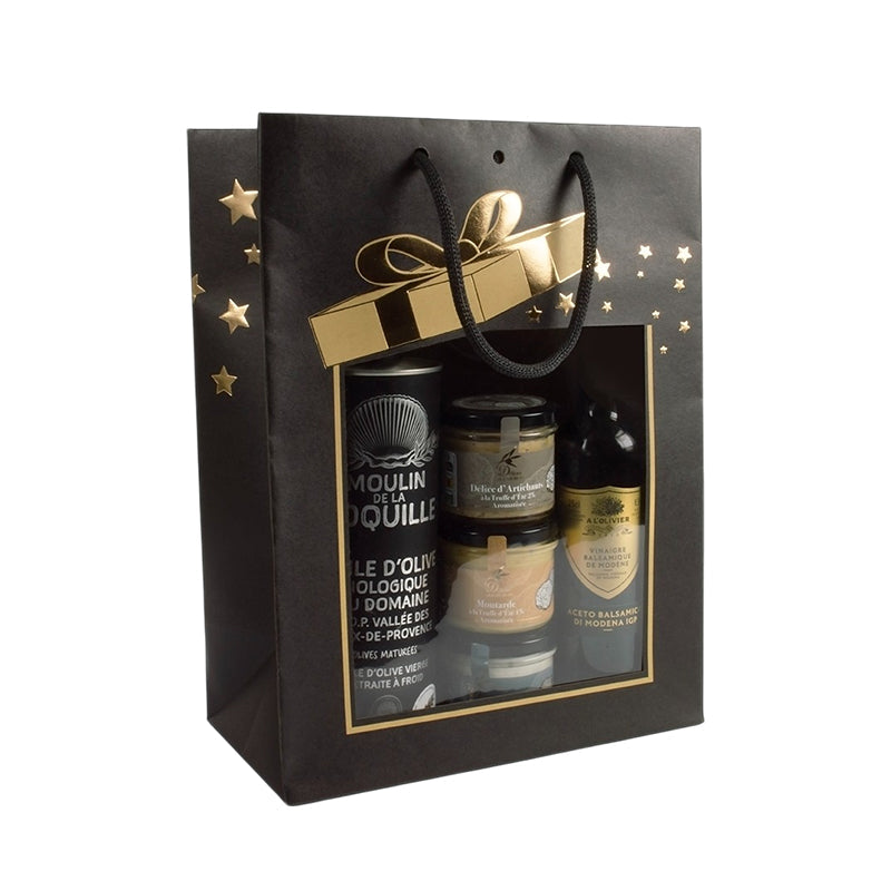 Sac vitrine fabriqué à partir de papier kraft brun impression noire, avec des motifs or en dorure à chaud.