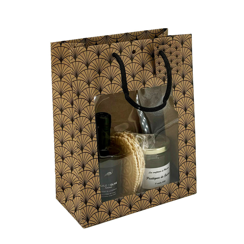 Une carte messsage permettant de personnaliser le cadeau est attachée à l'un des poignées.