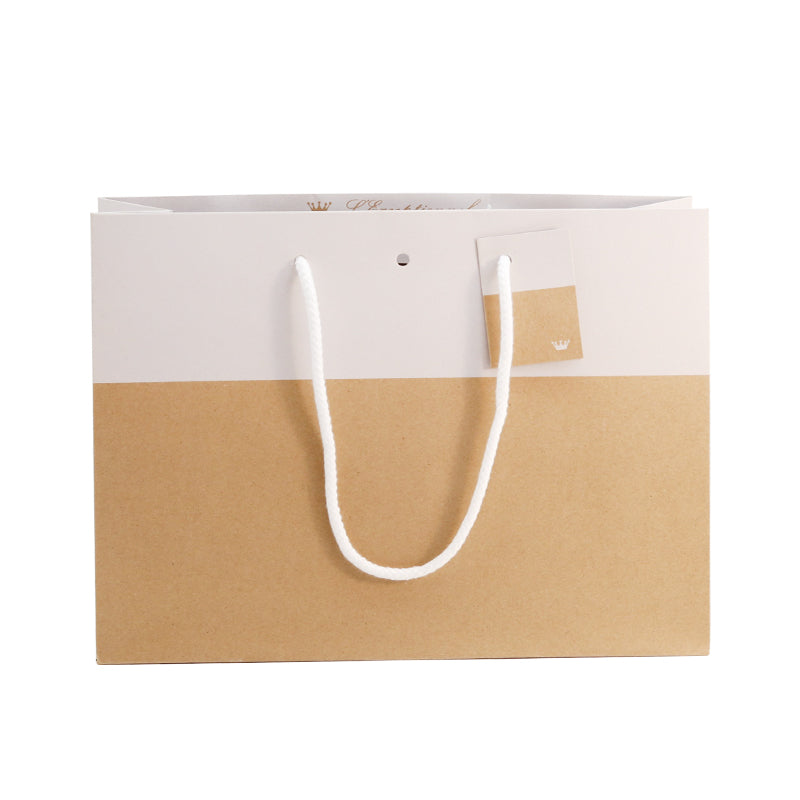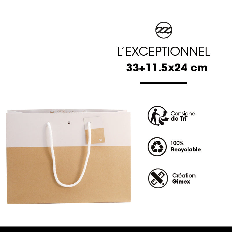 Sac boutique bicolore fabriqué à partir d'un papier kraft brun recyclé à plus de 70%, résistant et qualitatif en 175gr/ d'épaisseur. Muni de poignées en papier, il est 100% recyclable. Personnalisez le sac grâce à la carte message attachée à l'une des poignées.
