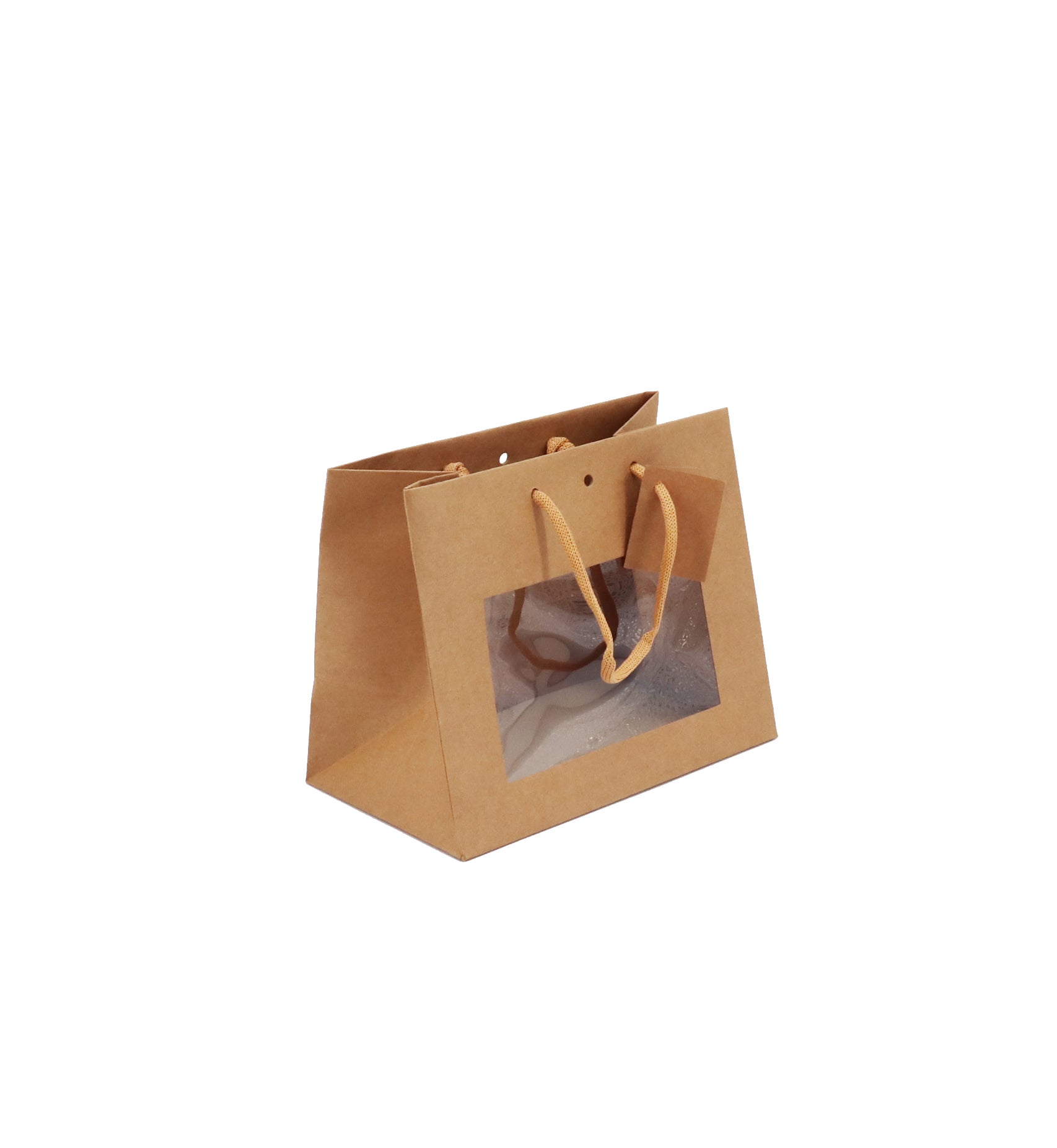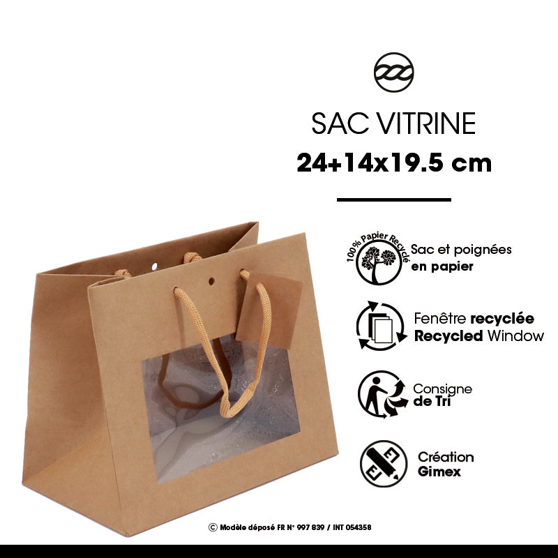 Sac boutique avec fenêtre fabriqué à partir d'un papier kraft brun 175gr d'épaisseur, finition haut de gamme. Muni de poignées en papier, il est 100% recyclable.