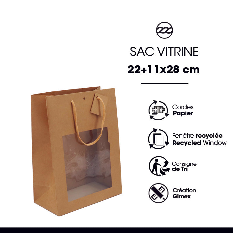 Sac boutique avec fenêtre pour mettre vos produits en valeur, fabriqué à partir d'un papier kraft brun 175gr d'épaisseur. Produit 100% recyclable et fabriqué avec des matériaux recyclés.