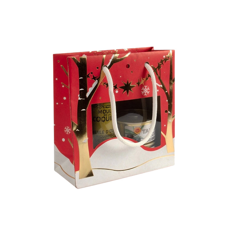 Sac vitrine fabriqué à partir de papier kraft blanc impression rouge, avec des motifs blanc et or.