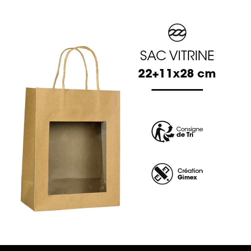 Sac boutique avec vitrine pour mettre vos produits en lumière, fabriqué à partir d'un papier kraft brun résistant et qualitatif en 180gr d'épaisseur.